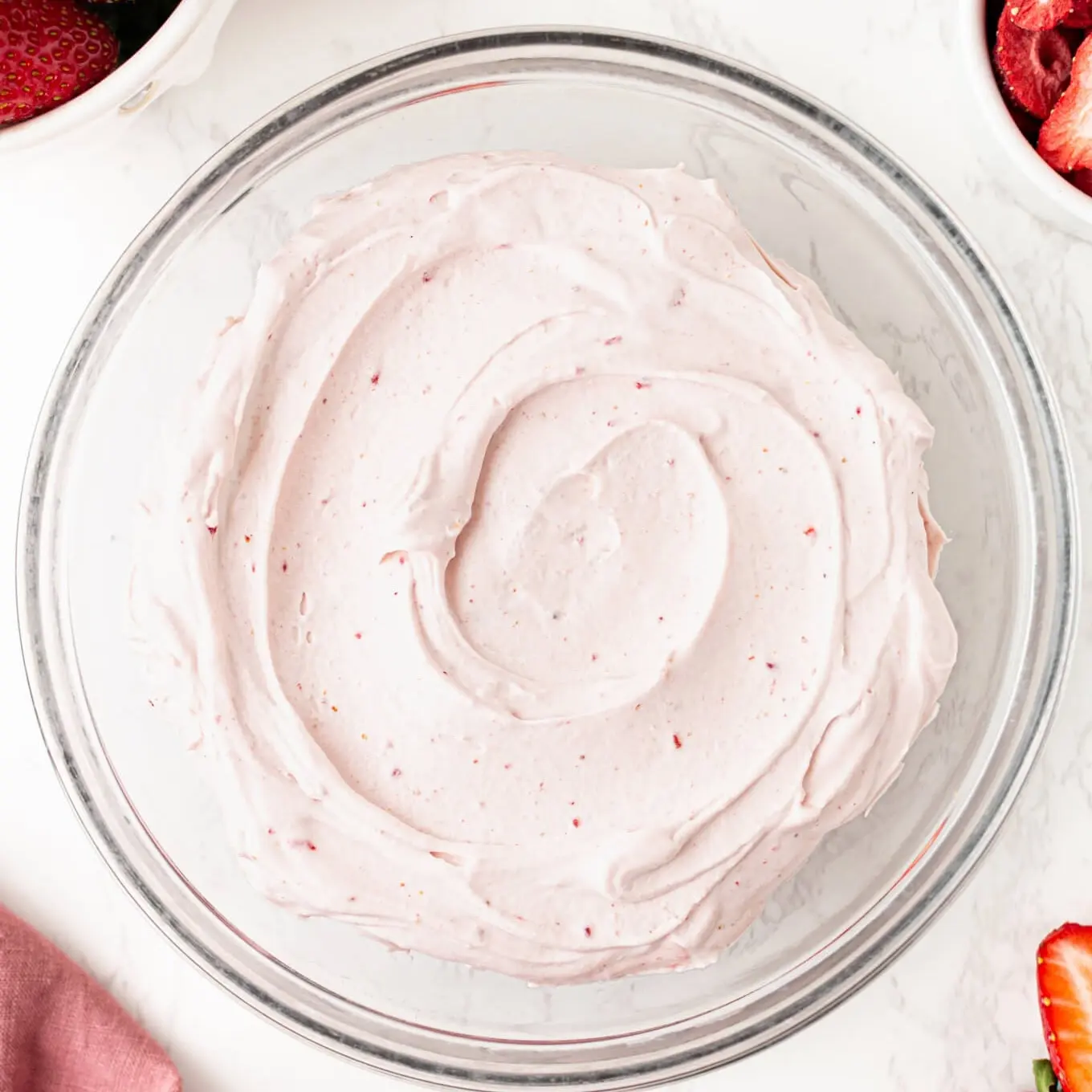 Crémeuse, légère et pleine de saveur de fraise pure, cette crème fouettée à la fraise est parfaite pour garnir vos gâteaux, cupcakes et bien d’autres desserts. Elle est réalisée avec des fraises lyophilisées au lieu de fraîches, vous permettant de la préparer toute l’année !